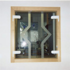 We used different kinds of hard wood on each side of the hatch to match the individual kind of wood used in the dining room and in the kitchen.